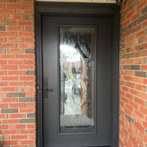 Order a dark grey steel front door with a full decorative glass insert. Durable, customizable, and low-maintenance.