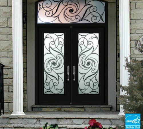 Black steel double front door with overhead transom, Canadian-made, customizable in size and colour, and built for privacy and everyday use.